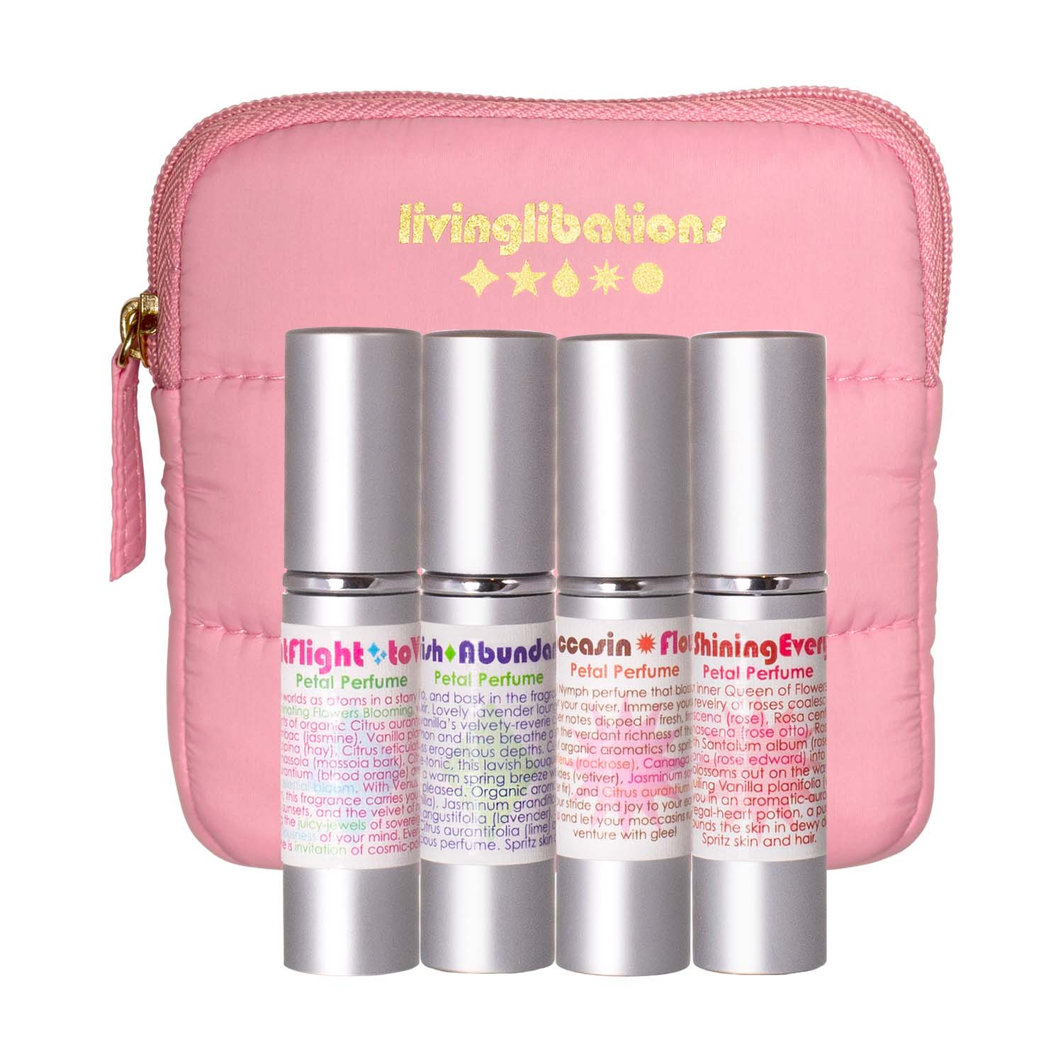 Our Perfect Puffer Pockets are concise carriers for your Living Libations creations, perfumes, and essences. These cushioned capsules streamline toting aromatic treasures to the gym, studio, and spa or for keeping your crystal Gua Sha set tidy and protected at home.
